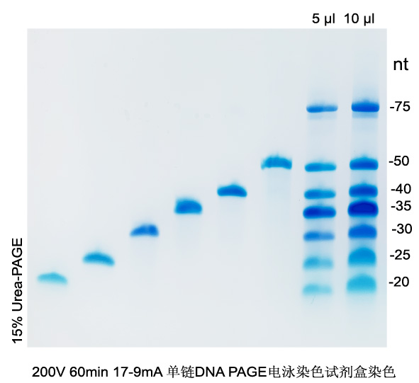 單鏈DNA Marker由不同長度的單鏈DNA分子混合而成,7條帶的大小為20,25,30,35,40,50,75nt。樣品保存在 TE緩沖液中,35nt 濃度為0.8μg/μl,其余條帶濃度為0.4 μg/μl。使用前與等體積2×TBE尿素上樣緩沖液混合即可上樣電泳。該Marker適用于跑尿素變性膠,電泳后使用單鏈DNA PAGE電泳染色試劑盒(Cat:RTS5103),核酸PAGE電泳染色試劑盒(Cat:RTS5102)或核酸快速高靈敏度染色試劑盒(Cat:RTS5101)染色均可以得到清晰的條帶分離效果。