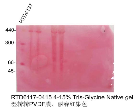 第一種方法:凝膠轉(zhuǎn)膜后用麗春紅染色液(貨號(hào):RTD6301)染膜,可以看到Marker條帶,順便可以檢測(cè)轉(zhuǎn)膜效率,然而要注意的是麗春紅染色靈敏度比較低,可能不能完全看到完整的Marker條帶。