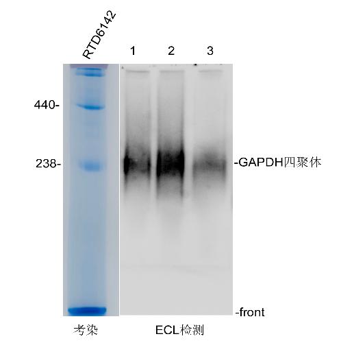 推薦使用RTD6137 非變性電泳蛋白質Marker(45-880 kD),RTD6142 高分子量非變性電泳蛋白質Marker II(45-669 kD)或者RTD6144 寬分子量非變性電泳蛋白質Marker 21-880 kD。然而由于凝膠濃度較低,低于45 kD條帶會壓在前沿,可能不可見。