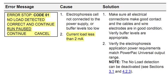 PAGE凝膠電泳期間,電流下降至低于1 mA很常見。有些電泳電源如伯樂電源有負載檢查功能,電流過低(低于4mA) 會認為沒有負載,報錯E1錯誤代碼,終止電泳。解決方法是更換電泳電源,如使用國產電源;另外可以調高電壓高于300 V,使得電流不要低于4mA。