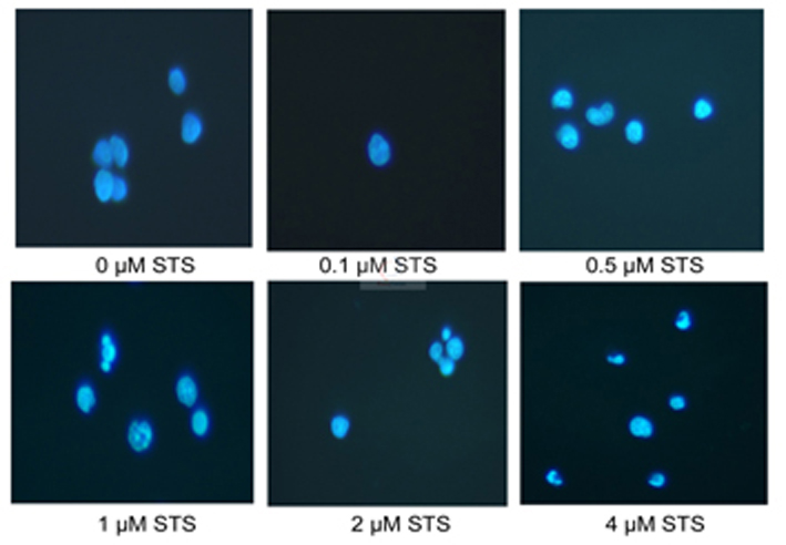 操作流程:使用不同濃度星飽菌素(Staurosporine,STS)凋亡處理Jurkat細(xì)胞。調(diào)整細(xì)胞密度為1×106/ml,每孔2 ml接種于六孔板中;加入終濃度為0,0.1,0.5,1,2,4 μM STS,37℃ 5%CO2培養(yǎng)3小時(shí);500 g 3 min收集細(xì)胞;細(xì)胞沉淀中加入1 ml固定液,常溫固定10 min;1×PBS漂洗兩次;細(xì)胞沉淀中加入0.5 ml Hoechst 33258染色液,37℃避光染色10 min;離心后細(xì)胞沉淀重懸于100 μl 1×PBS中;取5 μl細(xì)胞懸液滴于載玻片上,加5 μl 抗熒光淬滅劑,封片觀察。
