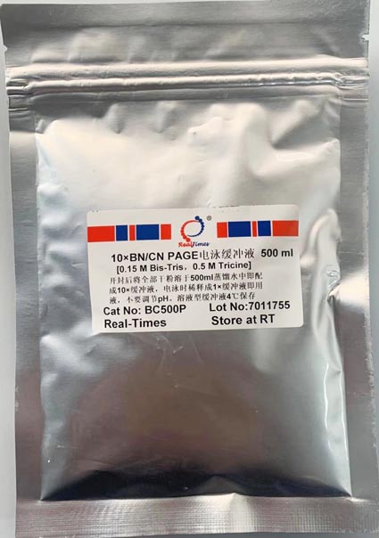 將10×BN/CN PAGE電泳緩沖液(干粉)溶于500 ml滅菌水中,徹底溶解,測定pH應(yīng)為7.0左右,不要調(diào)節(jié)pH。用前稀釋10倍即配成1×BN/CN PAGE電泳緩沖液。
