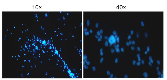 1.1.7 熒光顯微鏡使用紫外激發(fā),可檢測到呈藍色的細胞核。激發(fā)波長350nm左右,發(fā)射波長460nm左右。