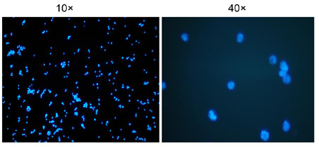 操作流程: Jurkat細胞,計數(shù)1×106/ml;500 g 3 min收集2 ml 細胞;細胞沉淀中加入1 ml卡諾固定液,常溫固定10 min;1×PBS漂洗兩次;細胞沉淀中加入200 μl Hoechst 33342即用型染色液(10 μg/ml);37度避光染色10 min; 離心后細胞沉淀重懸于100 μl 1×PBS中;取5 μl細胞懸液滴于載玻片上,加5 μl 抗熒光淬滅劑,封片觀察。