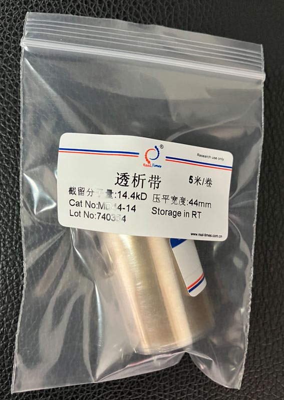 透析膜可用動物膜和玻璃紙等,但用的最多的還是用纖維素制成的透析膜,目前常用的是美國Union Carbide (聯(lián)合碳化物公司)和美國光譜醫(yī)學(xué)公司生產(chǎn)的各種尺寸的透析管,截留分子量MWCO(即留在透析袋內(nèi)的生物大分子的最小分子量)。截留分子量越大也就是說透過性越大。
