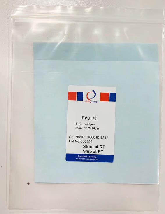 聚偏二氟乙烯(Polyvinylidene Fluoride,PVDF)膜作為基質(zhì)的轉(zhuǎn)印膜時(shí)由Millipore公司在1985年首先推出的。PVDF膜在蛋白質(zhì)截留能力、機(jī)械強(qiáng)度和化學(xué)相容性上比起NC膜來(lái)都有更好的優(yōu)越性能。例如,PVDF膜的蛋白結(jié)合量是100-200μg/cm2,而NC膜的典型結(jié)合量是80-100μg/cm2。PVDF膜分0.45μm和0.2μm的,后者孔徑小,對(duì)小分子蛋白(<20kD)有較好的攔截吸附。