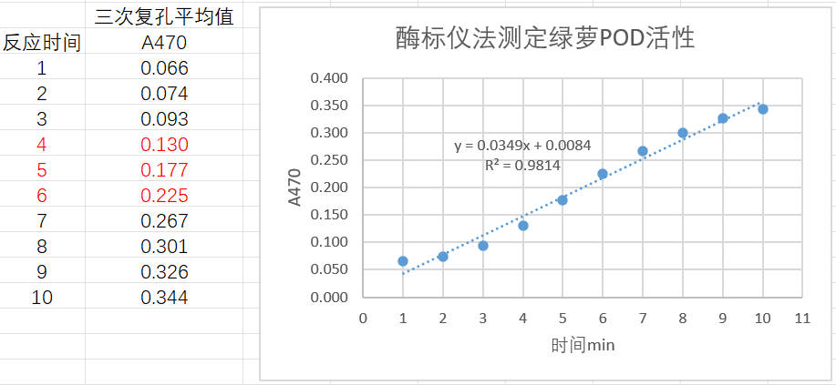 取0.5 克綠蘿葉片,加入5 ml提取液冰浴勻漿,制成10%勻漿液,12000 rpm 4℃離心10 min,取上清置于冰上,按照測定步驟操作,三個復孔,設定酶標儀檢測波長470 nm,間隔1 min采集數(shù)據(jù),采集10次;時間對吸光值做線性回歸曲線,4-6 min線性較好,2 min內(nèi)△A=0.225-0.130=0.095。