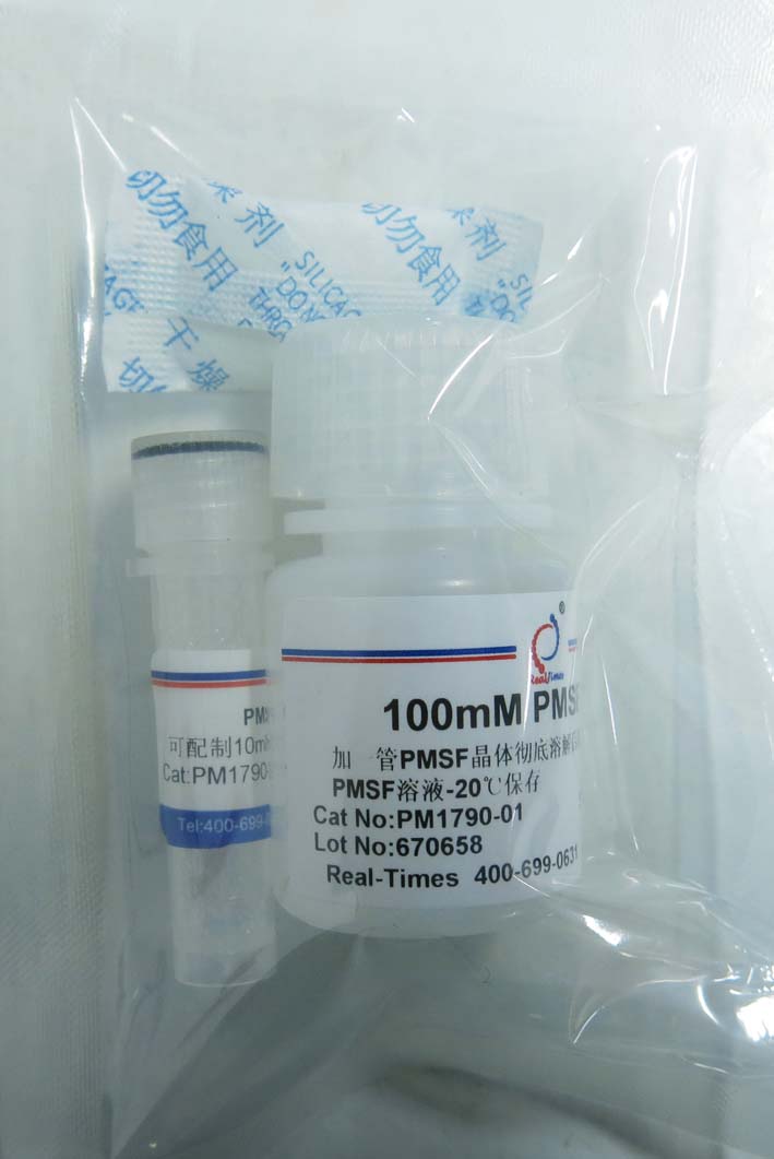 取一管PMSF晶體全部加入到PMSF溶解液中,徹底溶解后即配成100mMPMSF溶液。在蛋白提取緩沖液中稀釋100倍使用,如500