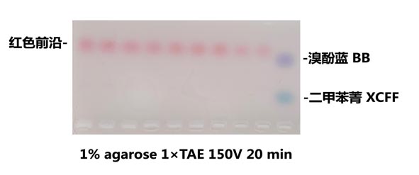注:紅色指示染料電泳中的遷移速度略快于溴酚藍(lán)。