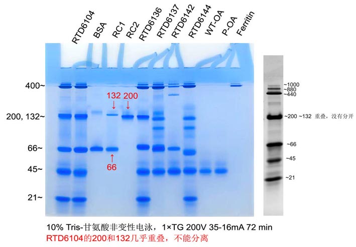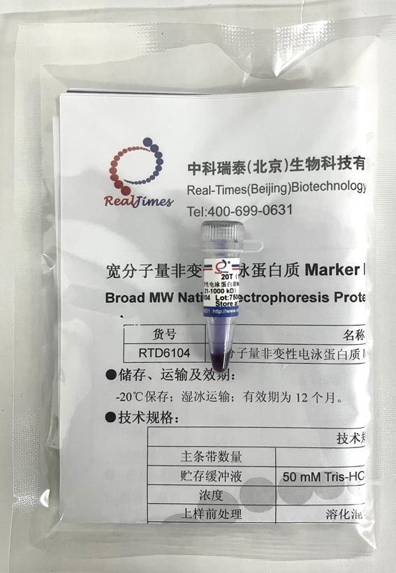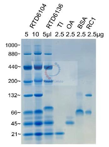 2. 非變性蛋白電泳Marker由于要保持蛋白的天然結(jié)構(gòu),都沒有偶聯(lián)染料,在電泳時基本都看不到條帶;但是RTD6104中的440