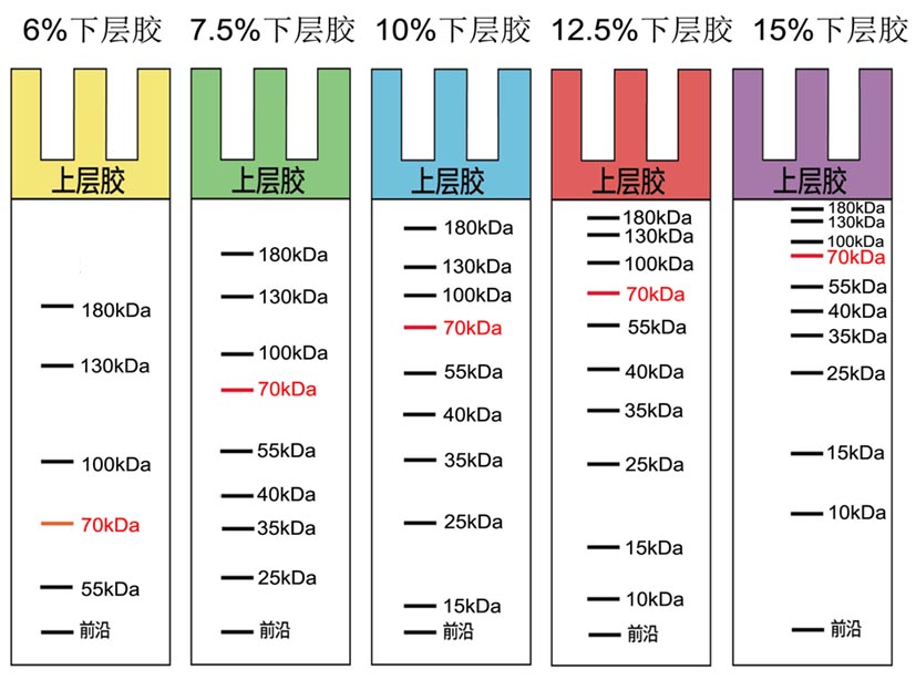 kDa,含有 10 條蛋白條帶 ) 在不同濃度的 SDS-PAGE凝膠中的分離示意圖。因溫度、pH 值等因素不同,實際分離情況會略有出入,本圖僅供參考。