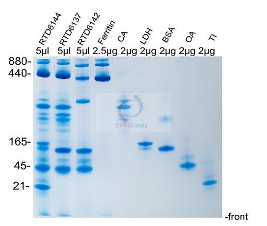 特別說明:由于本系統(tǒng)采用非連續(xù)Laemmli凝膠系統(tǒng)(Tris-Glycine系統(tǒng)),電泳凝膠系統(tǒng)pH在8.3-8.8,因此要求待分離的蛋白等電點pI≤8.0(酸性蛋白),這樣蛋白在凝膠系統(tǒng)內(nèi)帶負(fù)電荷,pI越低于8.0,帶更多的負(fù)電荷,在凝膠電泳中才能正常向正極泳動。如果待分離的蛋白等電點pI>8.0(堿性蛋白),請選擇堿性電泳凝膠系統(tǒng)分離(貨號RTD6131)。