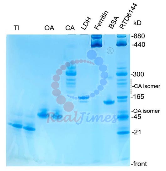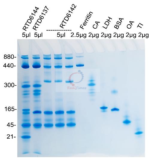 2. 該產(chǎn)品不含蛋白凝膠制備試劑,您可以選擇非變性PAGE凝膠制備及電泳試劑盒(貨號(hào):RTD6130)或者蛋白預(yù)制膠(貨號(hào)RTD6118)。如自備試劑,經(jīng)典Laemmli系統(tǒng)中把制膠溶液、電泳緩沖液和上樣緩沖液中的SDS和還原劑(DTT或β-巰基乙醇)全部去除即可進(jìn)行非變性電泳。