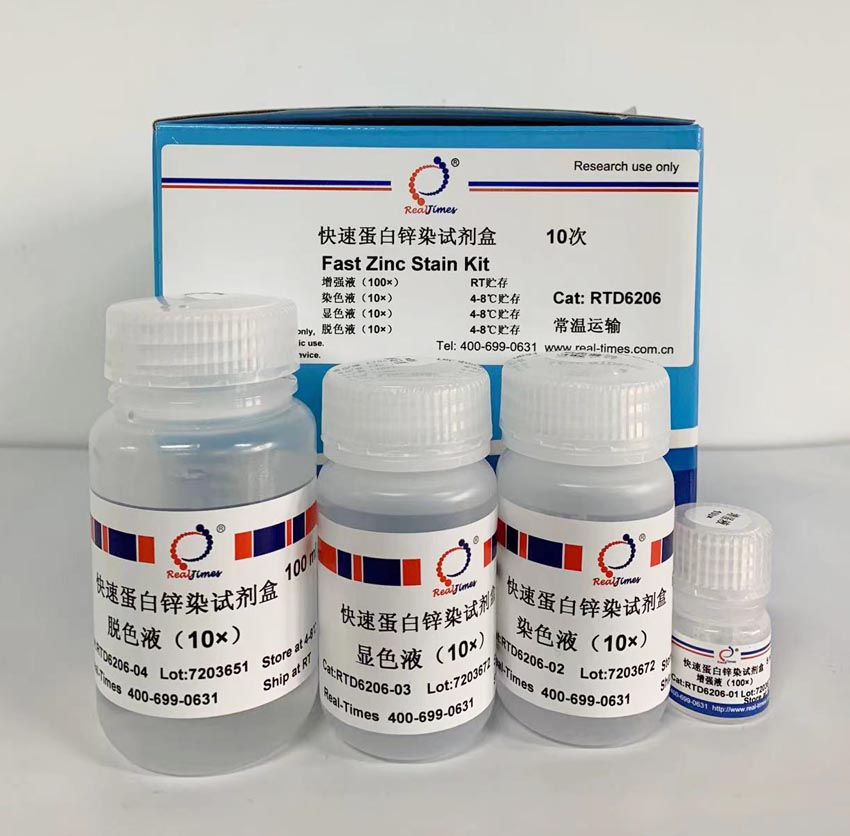 本試劑采用以鋅離子為基礎(chǔ)的負(fù)染色方法,用于SDS-PAGE或Native-PAGE電泳凝膠染色,不需要使用含有刺激性的甲醛和冰醋酸,實(shí)驗(yàn)方便快速,可以在30 min左右完成,最低能夠檢測出2 ng的蛋白條帶,該方法不對(duì)蛋白質(zhì)產(chǎn)生修飾作用,而且經(jīng)過脫色液處理后,可以用于電洗脫或采用PAGE膠蛋白微量回收試劑盒(貨號(hào):RTD8108)進(jìn)行膠回收,以便進(jìn)行質(zhì)譜和測序分析等,也可以用于其他染色方法(銀染或考染)對(duì)膠重新染色。