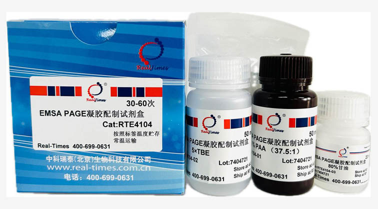 EMSA PAGE凝膠配制試劑盒(PAGE Gel Preparation Kit for PAGE)提供了配制EMSA PAGE凝膠所需的各種試劑,用戶只需自備制膠器具和蒸餾水,即可配制不同濃度的EMSA PAGE凝膠。凝膠遷移實驗(也稱凝膠阻滯實驗或電泳遷移率實驗)
