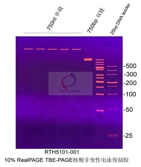 1.2 TBE- PAGE非變性電泳雙鏈DNA Marker可以選擇10 bp DNA ladder(10-100 bp)(貨號:RTM443)或20 bp DNA ladder(20-500 bp)(貨號:RTM441)或25 bp DNA ladder(25-500bp)(貨號:RTM444)作為分子量標準;單鏈DNA Marker可以選擇單鏈DNA Marker(20-75 nt)非預混型(貨號:RTM507)或單鏈DNA Marker(10-75 nt)非預混型(貨號:RTM509)。
