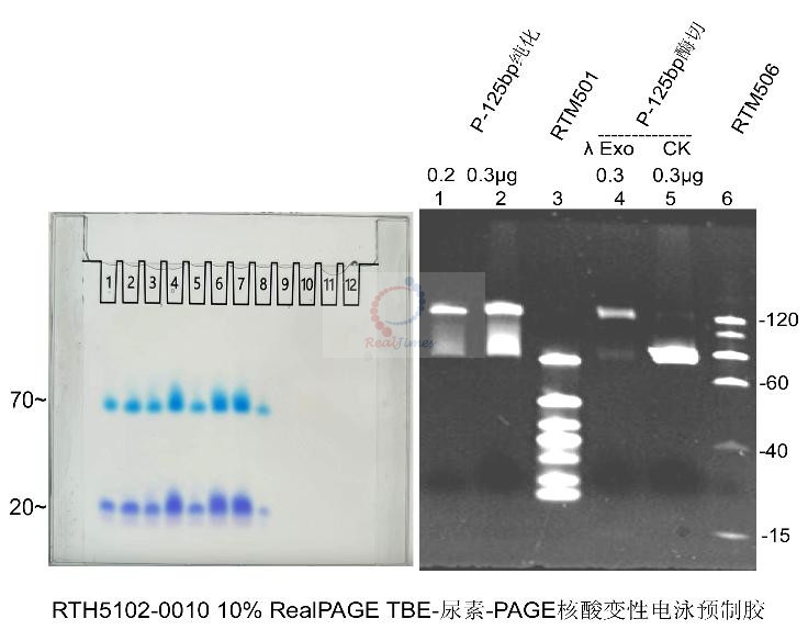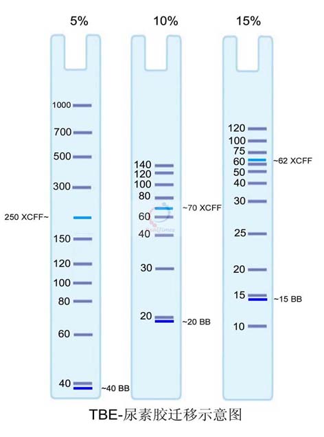 1.2 TBE-尿素-PAGE電泳可以選擇單鏈DNA Marker(25-75 nt)(貨號:RTM501)或單鏈DNA Marker (15-120nt)(貨號:RTM506)或單鏈DNA Marker(10-75 nt)預混型(貨號:RTM 508)作為分子量標準。