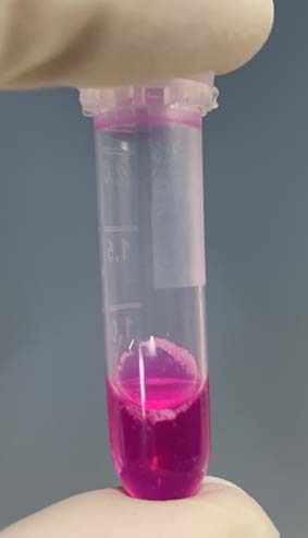 2. 向菌體沉淀的離心管中加入250 μl溶液P1(請先檢查是否已加入RNaseA)和5μl Lysis Dye,使用移液器或渦旋振蕩器徹底懸浮細菌細胞沉淀,此時溶液為渾濁的紅色。