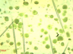 30克綠蘿葉片,加入150 ml 1×葉綠體提取緩沖液(即用型) 勻漿5×10秒,3次過濾共收集120 ml過濾液,平分4管,4℃ 1100 g 離心15 min,棄上清,每管重懸于1.5 ml 1×葉綠體提取緩沖液(即用型)中,共得到6 ml 葉綠體粗提液。2×3 ml 粗提液平鋪于2×5 ml 40%密度梯度液之上,4℃ 3200 g離心15分鐘,棄上清,每管沉淀重懸于1 ml 葉綠體重懸液中,共得到2 ml精制葉綠體重懸液,測(cè)定葉綠素含量為3.43 mg/ml重懸液。30克葉片提取得到6.86 mg葉綠體。取10 μl葉綠體溶液稀釋20倍,取50 μl稀釋液顯微鏡40倍物鏡觀察,如下圖。