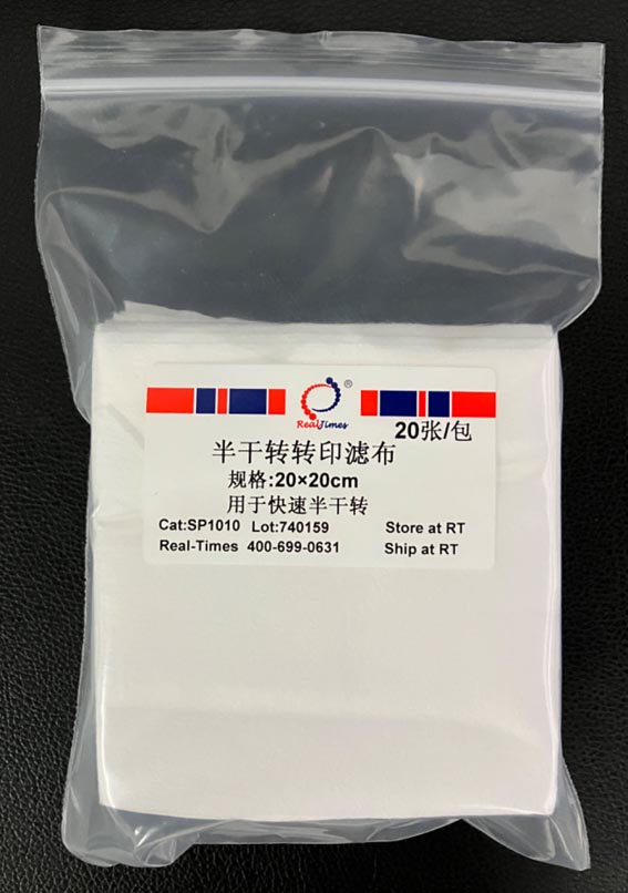 本轉(zhuǎn)印濾布可以耐受用于蛋白印跡中的甲醇、乙醇及其它有機(jī)試劑。濾布展開(kāi)大小為20×20 cm,無(wú)需自行裁切,根據(jù)需要可以自由折疊為使用的厚度,使用方便。