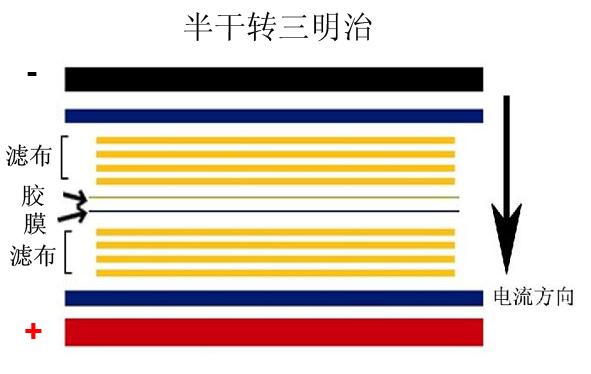 1. 將濾布折疊成10×10 cm大?。ㄋ膶樱?,鑷子夾取折疊好的濾布在轉(zhuǎn)膜緩沖液中浸濕3-5分鐘,按照下圖制作轉(zhuǎn)印三明治,正負(fù)極各放置一張折疊好的濾布。