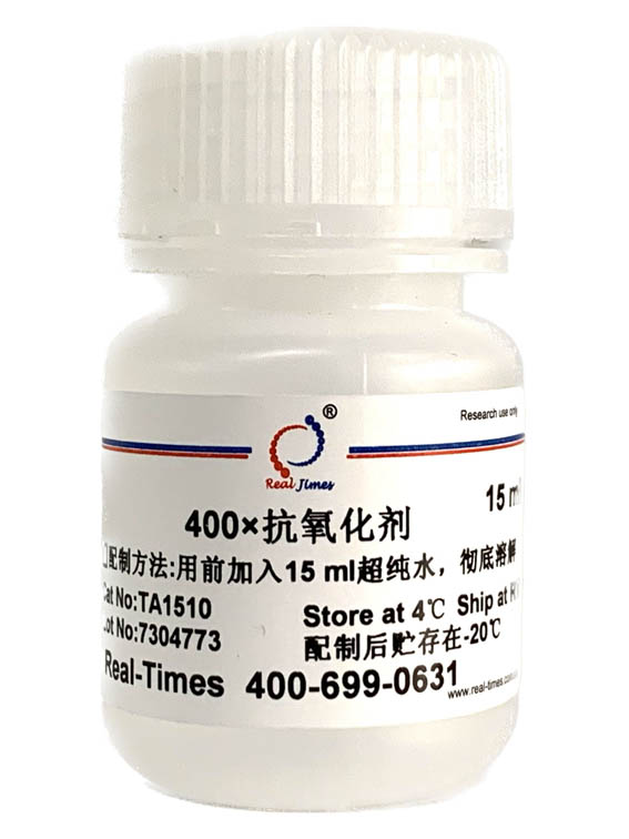 400×抗氧化劑為干粉,用前加入15 ml超純水震蕩徹底溶解后使用,已經(jīng)溶解的400×抗氧化劑-20℃貯存。