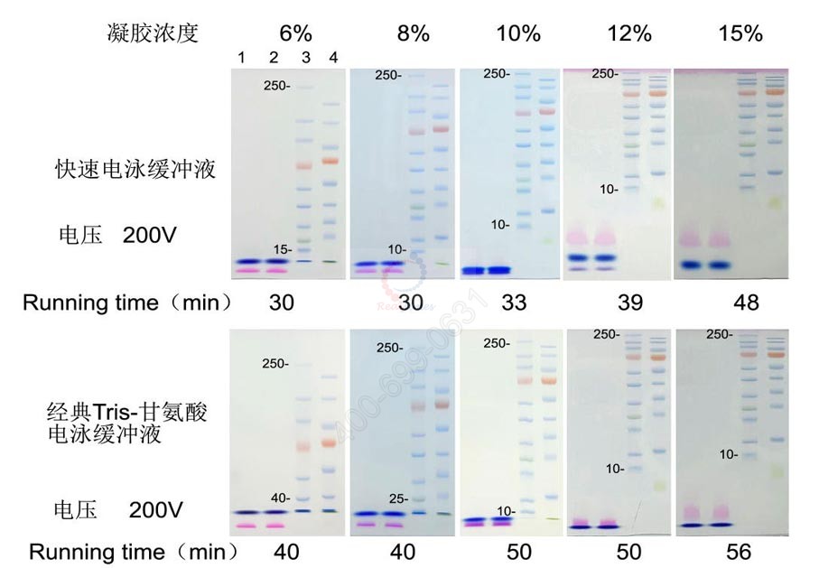 上圖為各種濃度分離膠使用快速電泳液的效果圖,