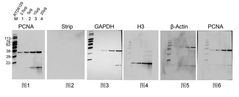 圖6:膜第4次清除后,PCNA檢測:PCNA鼠單抗 1:5000 RT 60 min孵育,羊抗鼠IgG-HRP 1:5000 RT 60min孵育,ECL曝光2秒。