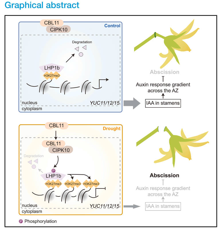 該研究發(fā)現(xiàn),干旱脅迫下SlCBL11/SlCIPK10-SlLHP1b信號模塊誘導(dǎo)番茄落花的作用機制。干旱脅迫激活SlCBL11-SlCIPK10鈣離子感受器模塊,磷酸化修飾SlLHP1b。磷酸化的SlLHP1b通過H3K27me3依賴的方式結(jié)合下游生長素合成基因SlYUCs的啟動子區(qū)域抑制其表達,導(dǎo)致雄蕊中生長素合成減少,破壞離區(qū)生長素梯度,誘發(fā)番茄落花。該研究揭示了干旱下鈣信號通過表觀遺傳調(diào)控生長素合成參與番茄落花的分子機制,進一步完善了植物逆境響應(yīng)中鈣信號與表觀遺傳調(diào)控的分子網(wǎng)絡(luò),還為培育耐旱、高產(chǎn)的品種提供了潛在的基因靶點。研究成果對提高逆境下的番茄產(chǎn)量,提高經(jīng)濟效益具有重要的指導(dǎo)意義。該研究獲國家重點研發(fā)計劃項目、國家自然科學(xué)基金面上項目和青年科學(xué)基金等項目支持。