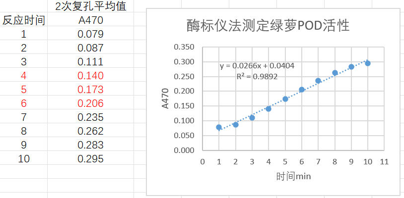 取0.5 克綠蘿葉片,加入5 ml提取液冰浴勻漿,制成10%勻漿液,12000 rpm 4℃離心10 min,取上清置于冰上,按照測定步驟操作,三個復孔,設定酶標儀檢測波長470 nm,間隔1 min采集數(shù)據(jù),采集10次;時間對吸光值做線性回歸曲線,4-6 min線性較好,2 min內(nèi)△A=0.225-0.130=0.095。