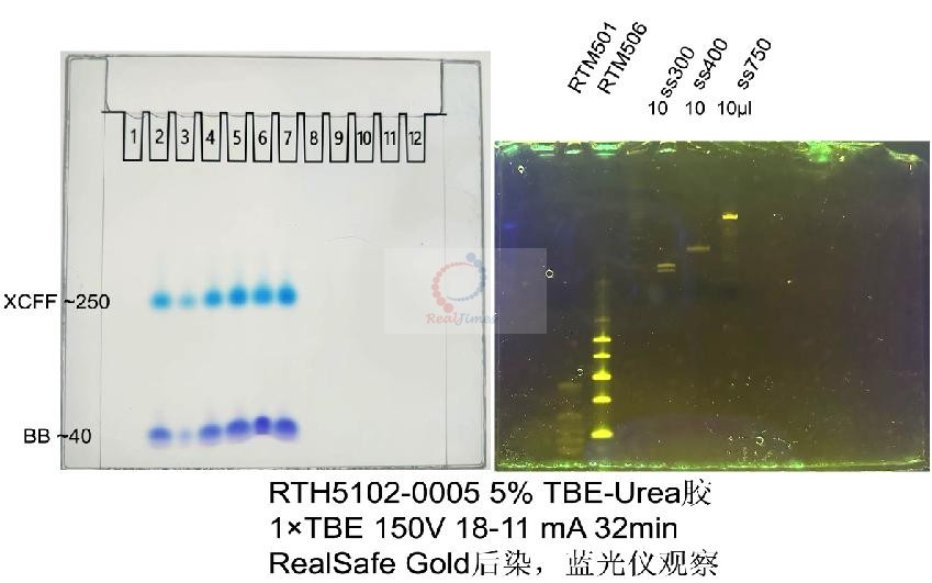 單鏈DNA或RNA樣品可以用單鏈DNA PAGE電泳染色試劑盒(貨號(hào):RTS5103),核酸PAGE電泳染色試劑盒(貨號(hào):RTS5102)或核酸快速高靈敏度染色試劑盒(貨號(hào):RTS5101)染色均可以得到清晰的條帶分離效果。注:如果使用核酸染料染色,RealSafe Red(貨號(hào):GR002)或RealSafe All(貨號(hào):GR004)核酸染料結(jié)合單鏈核酸效果最佳,強(qiáng)烈建議使用以便獲得最佳效果的膠圖。其余染料如GelRed,Goldview,EB等染色效果不好。